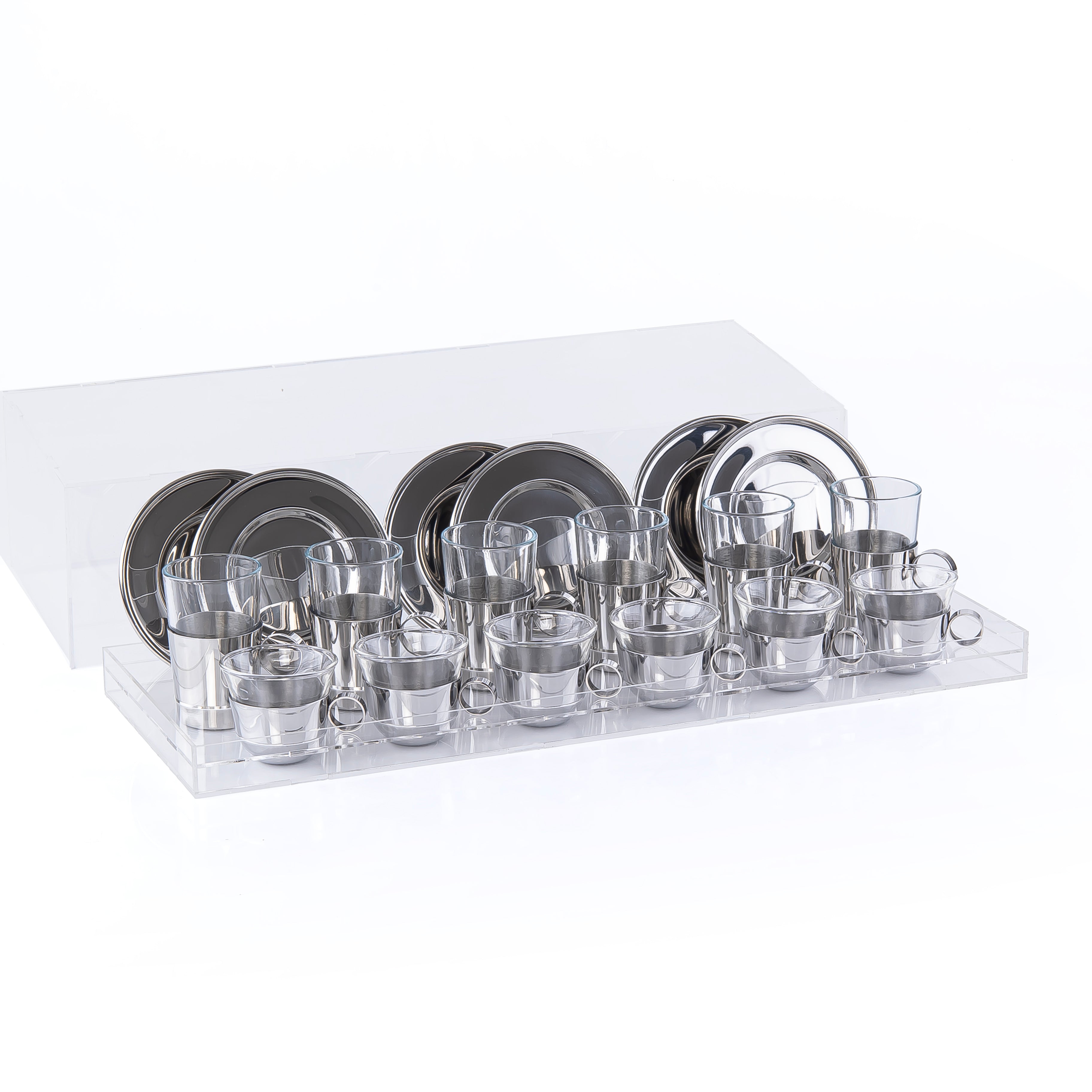 طقم من 6 فناجين قهوة و6 فناجين شاي و6 أطباق مع علبة أكريليك - فضي