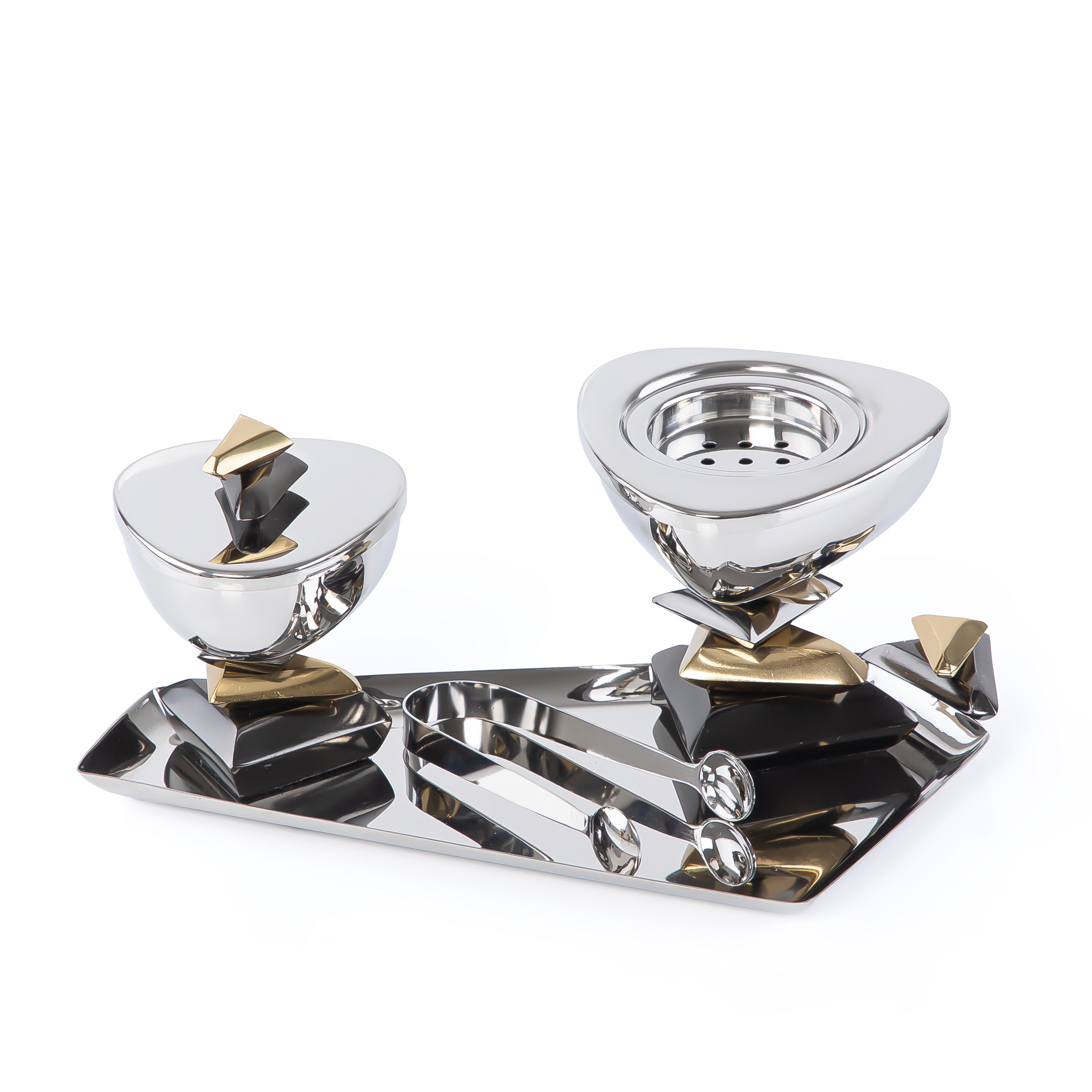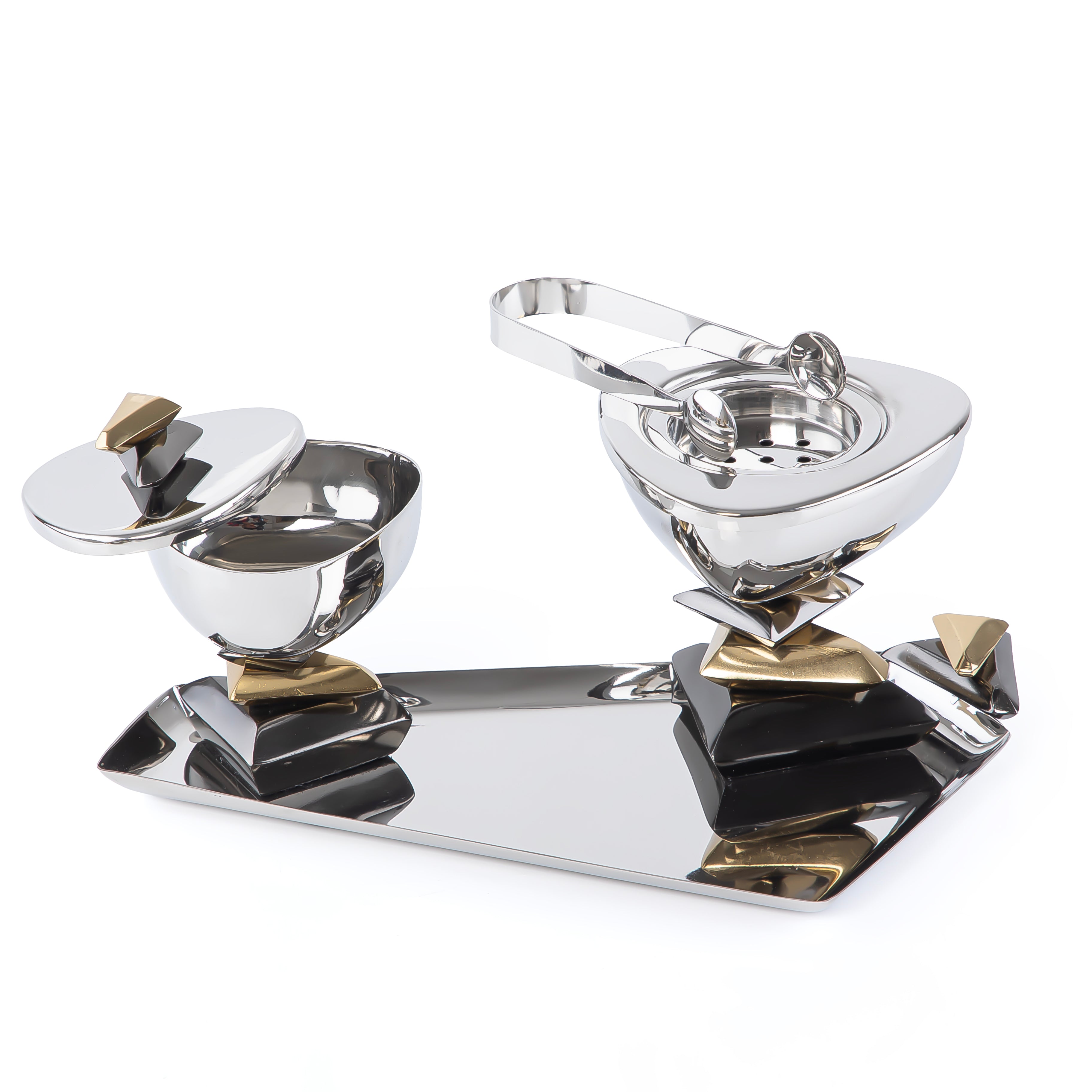 طقم مبخر فاخر مصنوع من المعدن عالي الجودة، بتصميم أنيق باللون الفضي مع الأسود، يأتي في علبة هدايا فخمة ويضم 4 قطع مثالية للضيافة والاستخدام اليومي أو كهديّة راقية.
