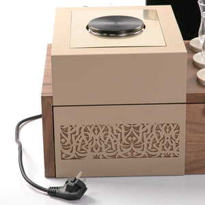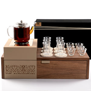 الطقم يحتوي على سخانة كهربائية معدنية موضوعة على قاعدة خشبية مستقرة. كما يشمل 6 أكواب شاي زجاجية وصحونها الدائرية، إلى جانب 6 فناجيل قهوة أسطوانية الشكل. جميع القطع مرتبة بدقة داخل درج خشبي أنيق مزود بنقوش زخرفية على جانب الجهة المعدنية العلوية للسخانة تمنح لمسة حديثة وتجعل الطقم عمليًا للحفاظ على حرارة المشروبات. يتم تقديم الطقم داخل بوكس هدية فاخر، مما يجعله مناسبًا للتقديم كهدية.