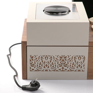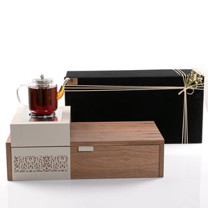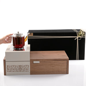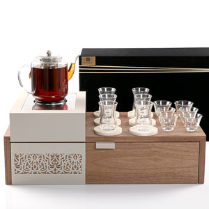 الطقم يحتوي على سخانة كهربائية معدنية موضوعة على قاعدة خشبية مستقرة. كما يشمل 6 أكواب شاي زجاجية وصحونها الدائرية، إلى جانب 6 فناجيل قهوة أسطوانية الشكل. جميع القطع مرتبة بدقة داخل درج خشبي أنيق مزود بنقوش زخرفية على جانب الجهة المعدنية العلوية للسخانة تمنح لمسة حديثة وتجعل الطقم عمليًا للحفاظ على حرارة المشروبات. يتم تقديم الطقم داخل بوكس هدية فاخر، مما يجعله مناسبًا للتقديم كهدية.