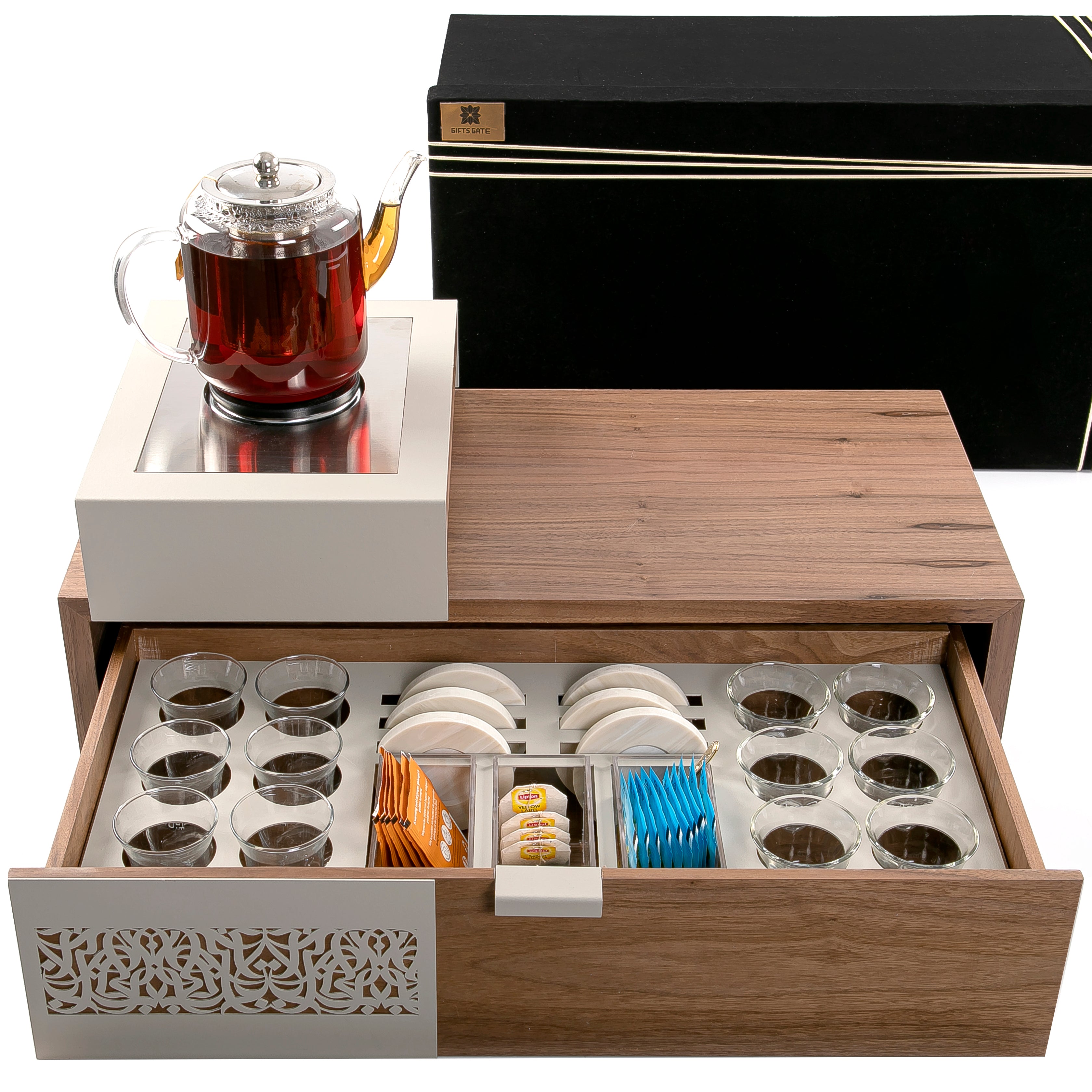 استاند خشب بدرج مع سخان كهربائي وأكواب شاي وفناجيل وبوكس هدية