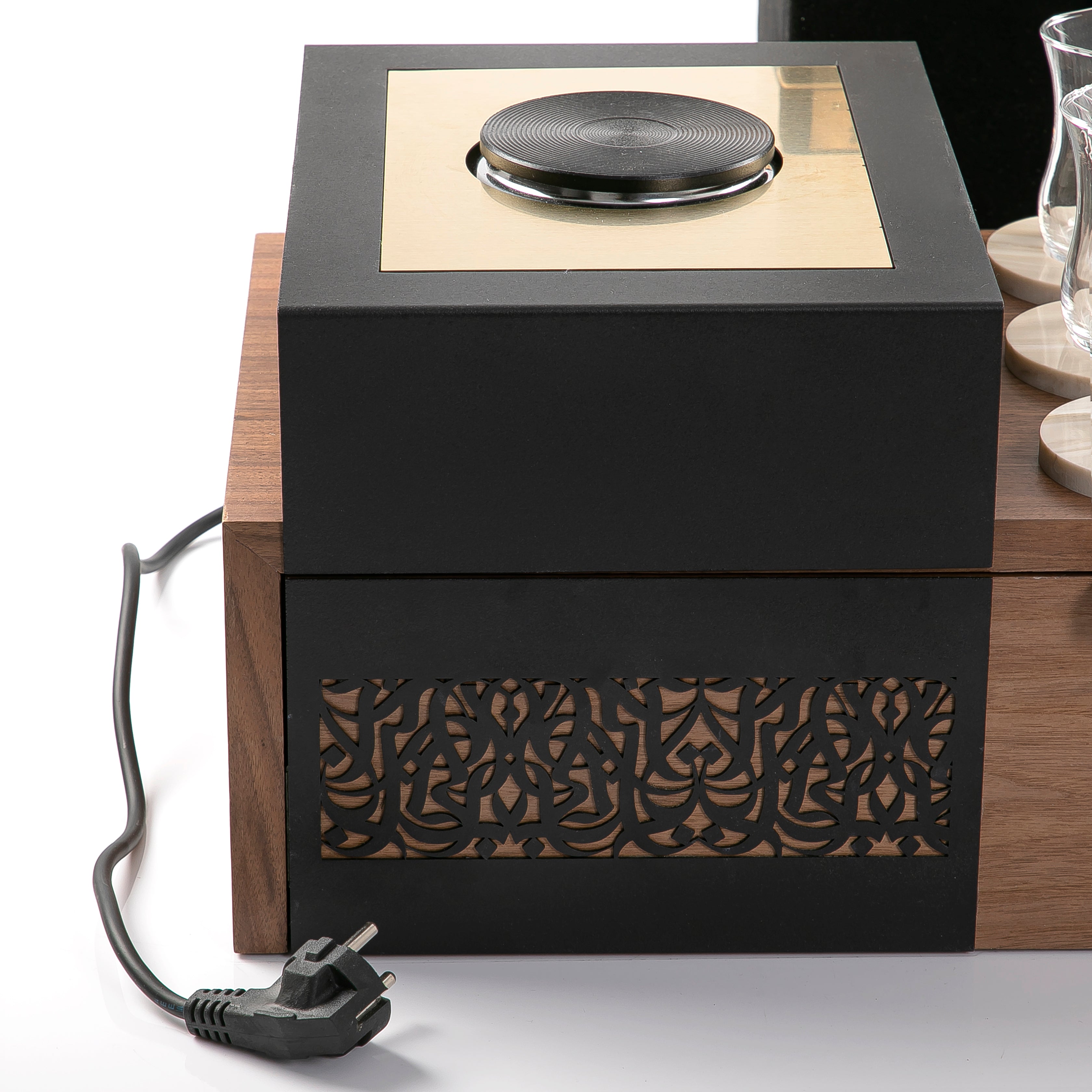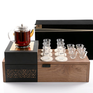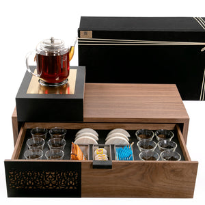 الطقم يحتوي على سخانة كهربائية معدنية موضوعة على قاعدة خشبية مستقرة. كما يشمل 6 أكواب شاي زجاجية وصحونها الدائرية، إلى جانب 6 فناجيل قهوة أسطوانية الشكل. جميع القطع مرتبة بدقة داخل درج خشبي أنيق مزود بنقوش زخرفية على جانب الجهة المعدنية العلوية للسخانة تمنح لمسة حديثة وتجعل الطقم عمليًا للحفاظ على حرارة المشروبات. يتم تقديم الطقم داخل بوكس هدية فاخر، مما يجعله مناسبًا للتقديم كهدية.