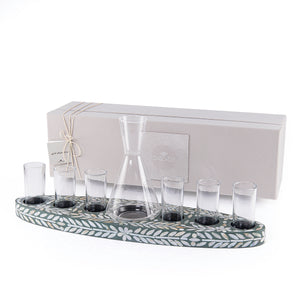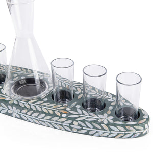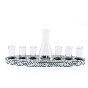 مواد التصنيع والتصميم: طقم مكون من صينية خشبية مزينة بصدفات، تحتوي على 6 أكواب زجاجية وإبريق لتقديم المشروبات. الطقم مقدم في صندوق هدايا.